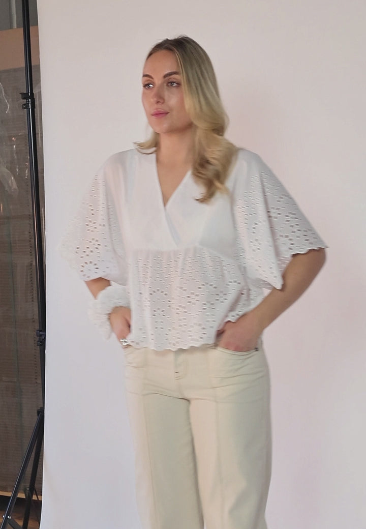 The AMOR blouse is a modern take on a feminine classic. Crafted from broderie anglaise, with short sleeves and clean lines, it pairs easily with your favorite jeans or a long, flowy skirt. A versatile piece that can elevate your everyday outfits.
