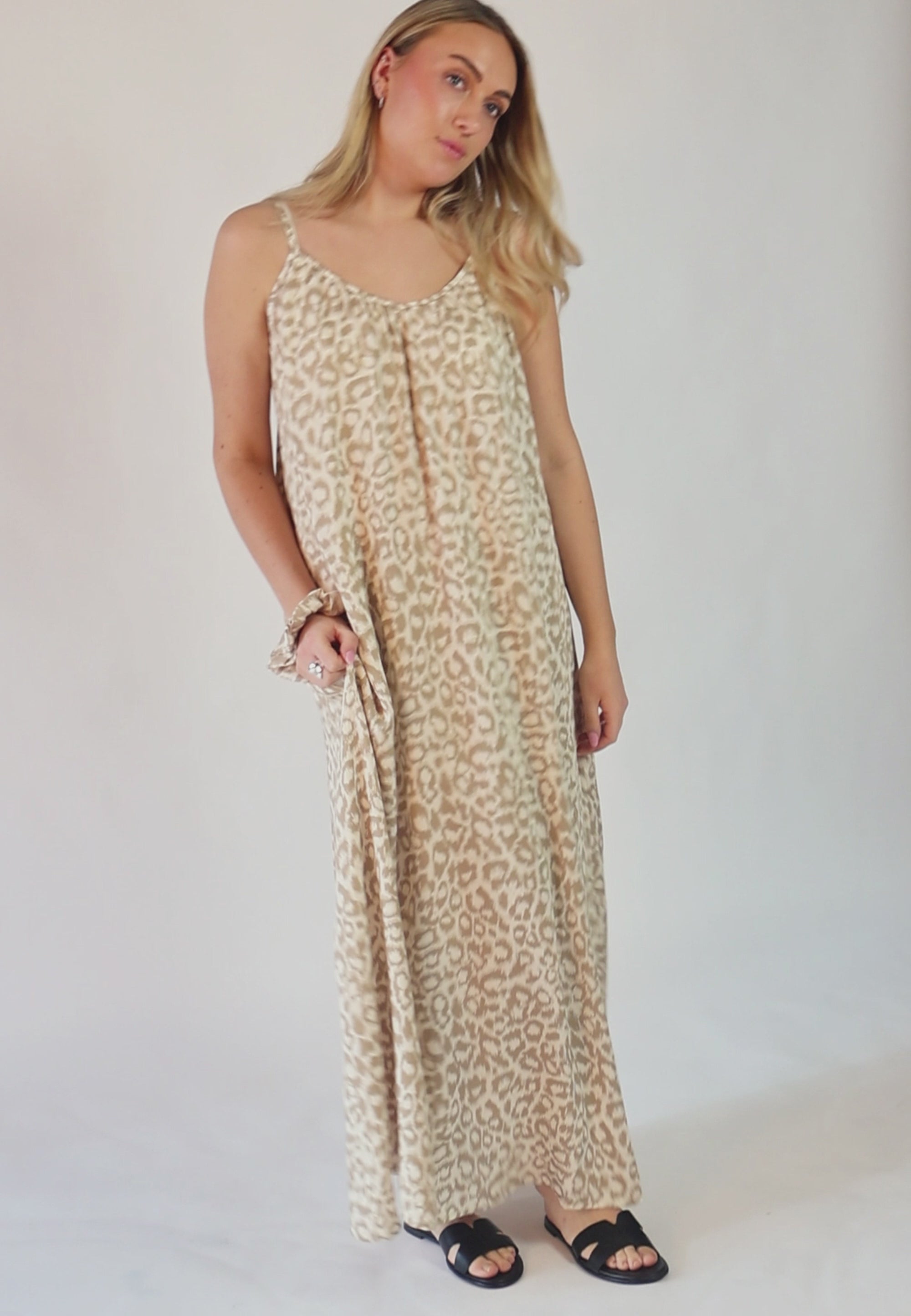 The TANSY dress is bold, breezy, and effortlessly stylish. Made in a striking leopard print, this long, loose-fitting dress drapes beautifully for a flattering, flowy silhouette. Whether you’re dressing up or down, this dress adds a splash of wild charm to any outfit.